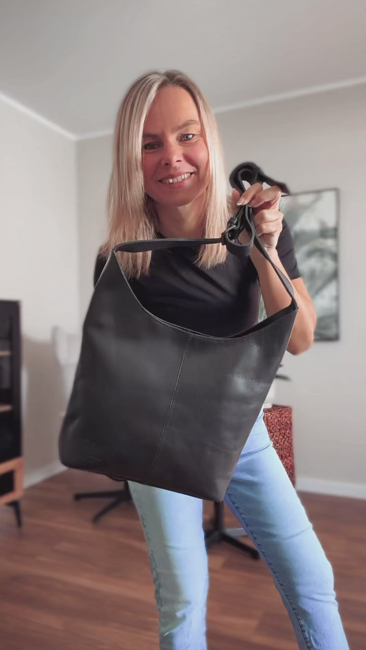 Ob du zur Arbeit pendelst oder durch die City schlenderst – diese Umhängetasche aus schwarzem, gewachstem Büffelleder macht alles mit. Ihr klares Design trifft auf hochwertige Verarbeitung und praktische Details: Das Hauptfach mit Reißverschluss sorgt für Sicherheit, während dich innen ein weiches Futter, ein Reißverschlussfach und zwei kleine Steckfächer erwarten – perfekt für Handy, Schlüssel & Co. Auf der Rückseite wartet ein weiteres Fach für alles, was schnell greifbar sein soll. Der lange, verstellbare Trageriemen macht die Tasche zum flexiblen Alltagsbegleiter – quer getragen oder klassisch über der Schulter. Diese Beuteltasche vereint Eleganz und Alltagstauglichkeit mit lässiger Leichtigkeit.